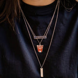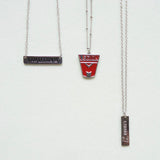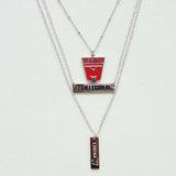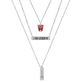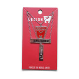 Show your pride in style with this Legion M 3 pack necklace set. They are three completely different necklaces of varying sizes to wear individually, 2 at a time, or all at once! Shortest necklace features the stacked Legion M logo with red enamel fill, the medium length necklace features the verbiage “I AM LEGION M” with black enamel fill, and the longest necklace features a de-bossed stamp with LEGION M. Material is imitation rhodium.