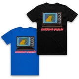Go retro with this incredible fan art created by Zack Wallenfang, featuring our favorite green monster Cheddar Goblin on TV. Inspired by the classic scene from the cult classic film MANDY when Red Miller watches the Cheddar Goblin Macaroni & Cheese commercial, foreshadowing his immanent revenge. Art was used with permission from artist Zack Wallenfang. Available in black or royal blue colorways, premium 100% combed ring-spun cotton, unisex crew neck style t-shirt. This fabric is comfortable and lightweight.